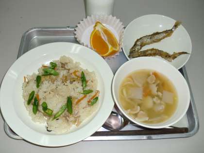 とりめし 牛乳 呉汁 ししゃものからあげ くだもの