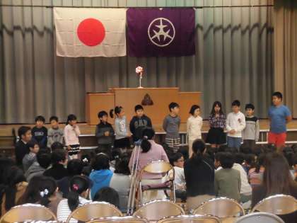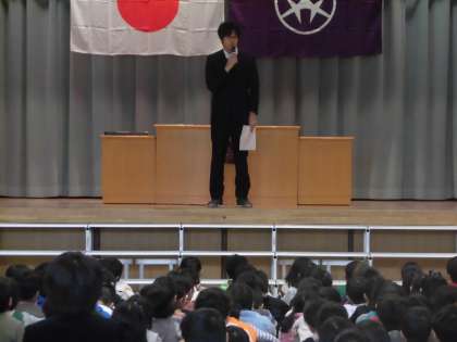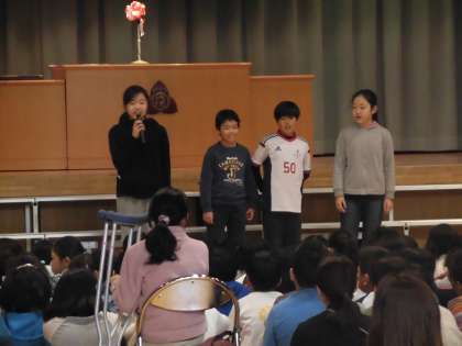 その後も、「代表委員会から『ユニセフ募金』のお礼発表」「転出児童の挨拶」「生活指導の先生から『春休みの生活について』のお話」と続きました。