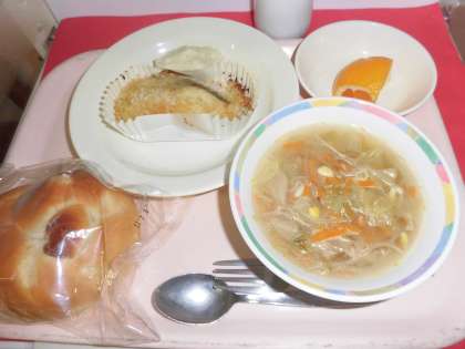 パインパン 牛乳 魚のパン粉やき ベーコンと野菜のスープ