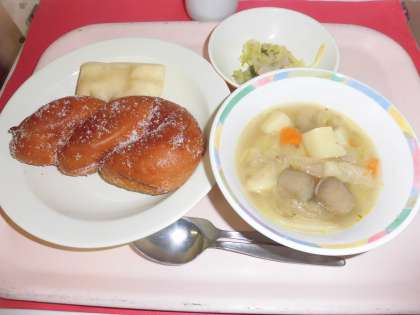 あげパン 牛乳 ポトフ ハムサラダ くだもの