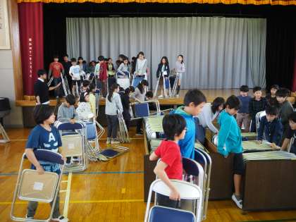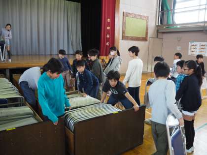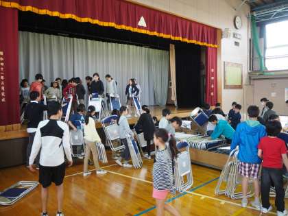 先日の保護者会で使用したパイプいすや、迎える会で使用したアーチ、1年生の防災ずきんを運んだり、片づけたりします。こういった仕事を、丁寧にきちんとする姿が素晴らしいですね。なかなか見えない部分ですが、学校の中で6年生はこのような裏方の仕事をたくさんしてくれているのです。
