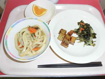 煮込みうどん 牛乳 大学いも 海藻サラダ くだもの