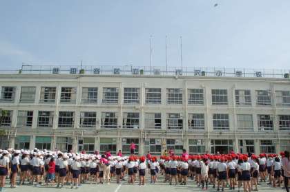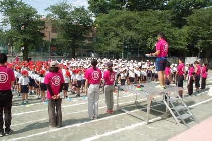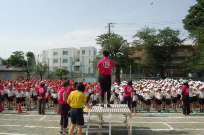 今日の体育朝会では、はじめて紅白に分かれて整列しました。