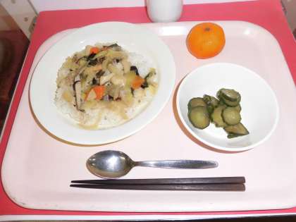 中華丼 牛乳 きゅうりのピリ辛和え くだもの