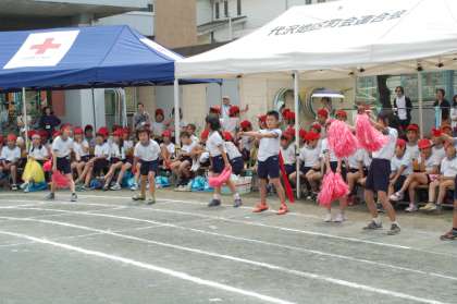 5・6年団体競技のため、3・4年の応援団が騎馬戦を盛り上げようと頑張っていました。