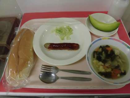 *今日は、ホットドッグです。コッペパンにゆでたキャベツ、