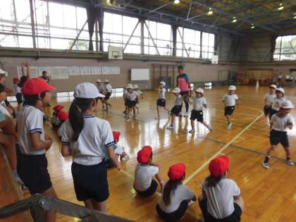 体力テストの種目「20mシャトルラン」を体育館で1年生が行いました。20mの間隔で引かれたラインを往復する種目です。6年生が、きちんとラインを超えているか見る係と記録をする係を手分けして行い、お手伝いをしています。