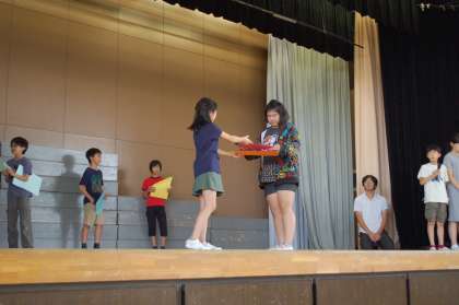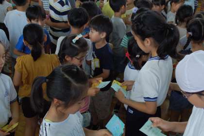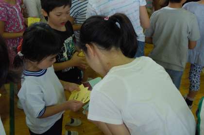 今朝は、集会委員による集会です。事前に用意した名刺を交換するゲームです。好きな動物、好きな色・・・6種類の名刺を自己紹介しながら交換しました。6年生は低学年に上手に話しかけていました。さすがですね。