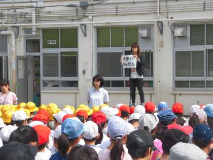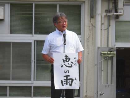 今日の校長先生のお話は、「恵みの雨」。雨にはいいこともある、という話を「雨降って地固まる」の慣用句と共にお話されました。