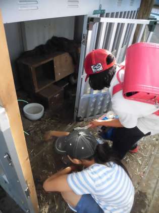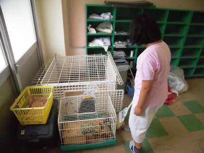 ウサギの「キャラメル」はケンカをしてしまうので、飼育小屋とは別のケージで飼育されています。飼育小屋ではウサギの「うみ」と、カメたちが飼われています。毎日朝と放課後に欠かさずフンの始末やエサ・飲み水の交換などを行っています。時にはリードをつけて、小屋から出してお散歩をしてあげることもあります。