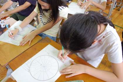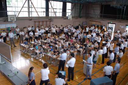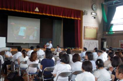 体育館に運び込んだ机・椅子に座り、100人を超える先生方に囲まれ、いつもと違う雰囲気に飲み込まれそうな6年2組の子どもたち。それでも、先生の発問に挙手し答えたり、課題を自分の方法で解決したりしていました。扇風機と冷風機をフル回転させても、汗がしたたる体育館でしたが、いつもと変わらず、熱心で真剣な子どもたちは立派でした!