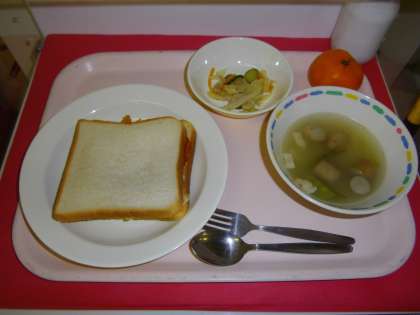 ウインナーとキャベツのスープ ツナサラダ 冷凍みかん