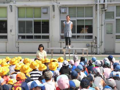 熱中症について養護教諭からお話がありました。「のどが渇いた」と感じる前から、こまめな水分補給を心がけましょう。