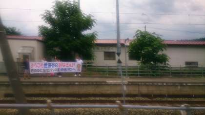 舟形駅を通過するとき、歓迎の横断幕が。そして、舟形小ご見えました。ワクワクです!
