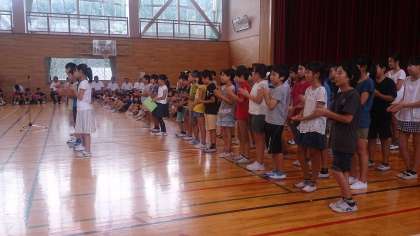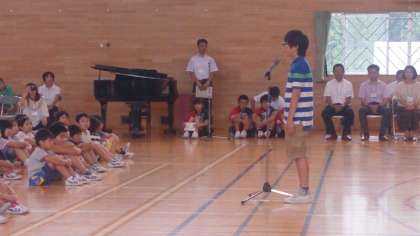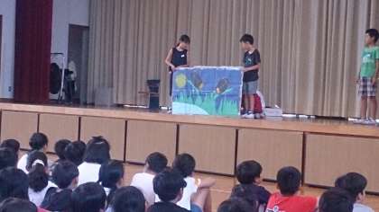 各校の自己紹介タイム。そして、児童代表のことばと続き、舟形小の4年生が舟形紹介をしてお迎え集会は終わりました。