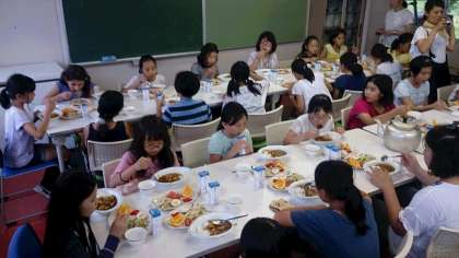 実習館に着いて、晩ごはんです。これから花火やお風呂タイムと続きます。