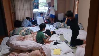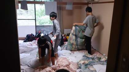 2日目のスタートです。曇りです。みんなで協力して、布団をたたみます。