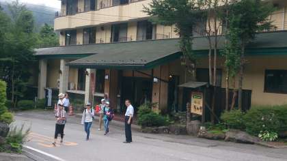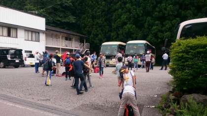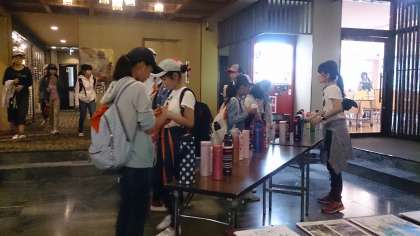 水筒を受け取って、バスに乗り込みます。虫除けスプレー。