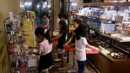 楽しみにしていたお土産タイムです。お風呂タイムと組み合わせて時間をうまく使っています。だれに何を買おうかな。みんなワクワクしながら選んでいました。