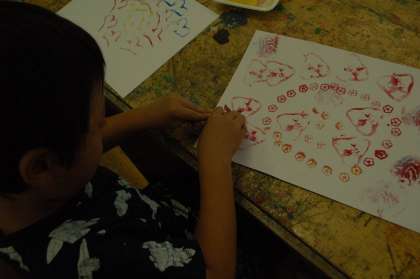 さまざまな旬の野菜をスタンプでペタペタ。切り方によって、同じ野菜も形が全然ちがいます。今日は、お店や食卓に並ぶ野菜が、少し変わって見えるのではないかな。
