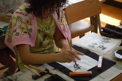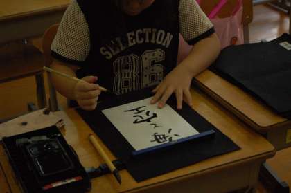 本日最後に紹介するのは、校長先生による書道教室です。自由に、心のままに、筆を動かす子供たち。文字の配置や墨の濃さなどにこだわりながら、自分の書と向き合っていました。