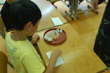 まずは、先生による一連の所作を解説付きで見学しました。そして、いよいよ自分たちの番です。主人と客人を交互に体験しました。どの子も、お友達(主人)の点てたお抹茶を、大切そうにいただいていました。和菓子を選ぶときは、顔がほころんでいました。