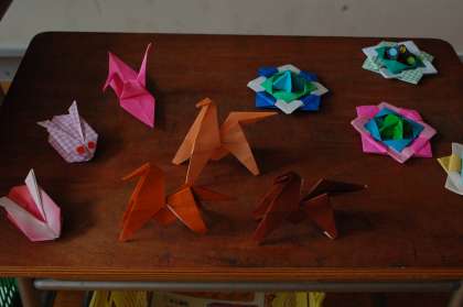 今日の折り紙教室は、中学年。少し難しい折り方に挑戦です。3枚を組み合わせて作ったコマはとてもよく回ります。キラキラやチェックの折り紙で丁寧に作っていました。馬は、回転します。作っている最中も、作り終わった後も楽しい折り紙教室でした。