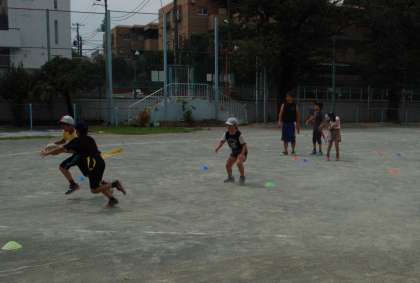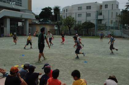 本校教員によるタグラグビー講座。「タグラグビーって何だろう?」そこから始まり、タグ取りやパス回しなどをやり、最後はゲームで汗を流しました。後ろにしか投げられないのについ前に投げてしまう!かと思えば、華麗なステップがフェイントとなり得点する子も!初めてのスポーツに興味津々の子ども達でした。