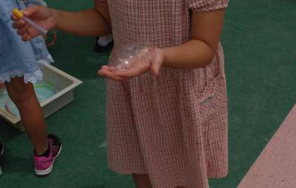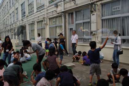 「どんな実験かは当日のお楽しみ」ということで、50名の低中学年が集まりました。実験は・・・というと、低学年は巨大シャボン玉、中学年は空気砲。秘密の液体を入れたシャボン玉は、長〜く伸びて、大歓声。空気砲では、的を倒して得点を競い合いました。