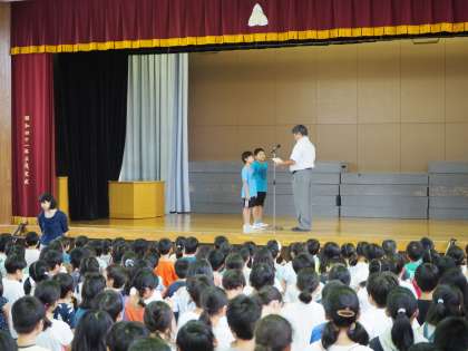 3年生2人が入賞した、剣道大会の表彰がありました。努力が結果に結びつきましたね。