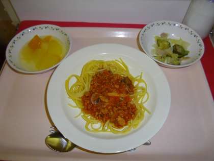 なすいりスパゲッティミートソース 牛乳 ハムサラダ