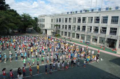 朝早く登校した集会委員が、教員と準備を行いました。進行は児童が中心となって行うことができました。せせらぎ班ごとに整列させるのは、6年生の班長の仕事です。このような活動の運営を通じて、子ども達は様々なことを学んでいます。