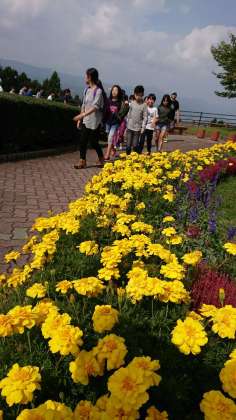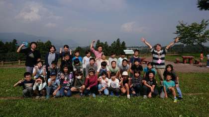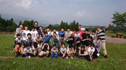 クラスごとに集合写真です。今日は今のところいい天気です。