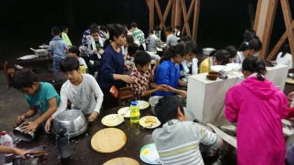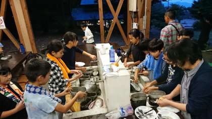 さあ、片付け。来たときよりもきれいに。少ない水道をうまく譲り合って片付けてます。