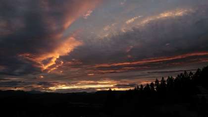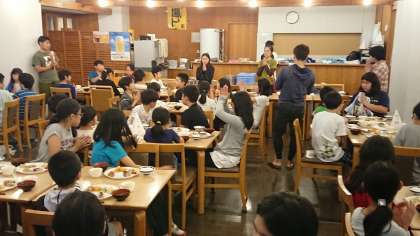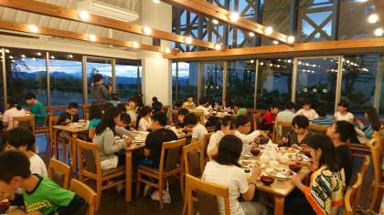 燃えるような夕焼けでした。みんなお腹が減ってるみたいです。お風呂も終わってさっぱりした中で、いただきます!