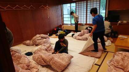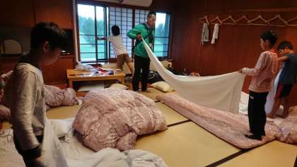 おはようございます。みんな、ばっちり起きてますか?協力して、片付け始めました。窓を開けると、寒い!