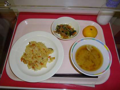 山菜おこわ 牛乳 豚汁 小松菜と春雨のサラダ