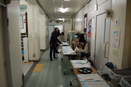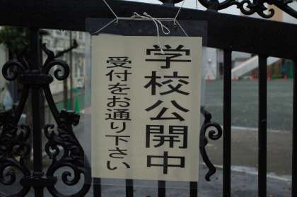 あいにくのお天気ですが、始業時より保護者の方や地域の方にお越しいただき、ありがとうございます。受付も保護者の方にお手伝いいただいています。