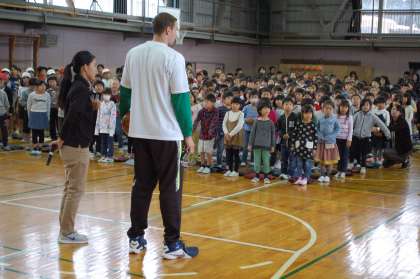 3・4時間目は5・6年生が実技指導を受けました。現役選手からの指導に、子ども達は目を輝かせながら取り組んでいました。