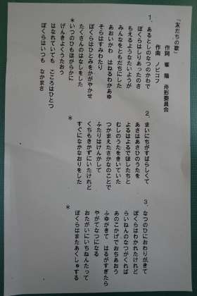 今日の全体の歌は「ともだちのうた」。ロシアの曲を原曲に、日本語の歌詞をあてたものです。代沢小学校で歌われているものは、舟形交流に向けて少し歌詞を変えたもので、毎年、交流の際に歌われ続けています。合奏は音楽クラブの児童が行いました。
