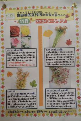 写真の花は、1年1組の子どもが生けたものです。今月の花は、「バラ」「実バラ」「ヒペリカム」「アイビー」です。ワンコインクラブの皆さま、ありがとうございました。