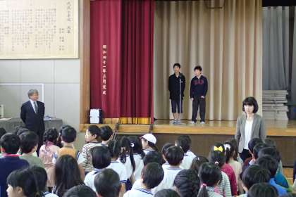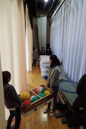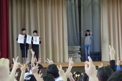 今日の児童集会は、舞台上の幕の間で投げられたものを当てるクイズでした。ものの名前だけではなく、投げられたものの色や、個数を答える問題もあり、集会委員の工夫が感じられました。子ども達は楽しそうに参加していました。