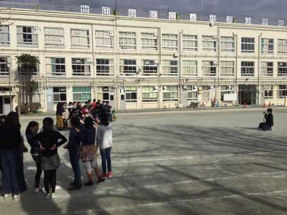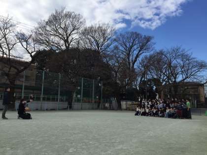 集合写真を撮る6年生の様子です。朝の冷え込みは厳しかったですが、この頃には寒さも和らぎ、暖かな日差しの中で撮影が行われました。校庭ではお楽しみ会を楽しむクラスもあり、学期の終わり、一年の終わりを感じる、ゆったりとした時間が流れているようでした。