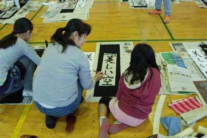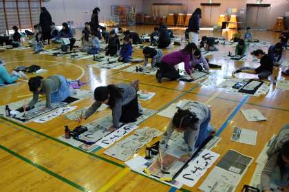 学校運営委員会主催の書き初め教室が行われました。運営委員長の田中さんをはじめ、地域の方々が5人も先生として来てくださいました。午前中が3年生。午後が4,5,6年生でした。初めて大きな紙に書く3年生は、最初は慣れなくてうまくいきませんでしたが、先生方のアドバイスで、だんだん上手に書けるようになっていきました。午後の子どもたちは、慣れている子が多くどんどん自分で書き進めていました。「字は心を表す」背中がすっと伸びた様な気持ちになりました。