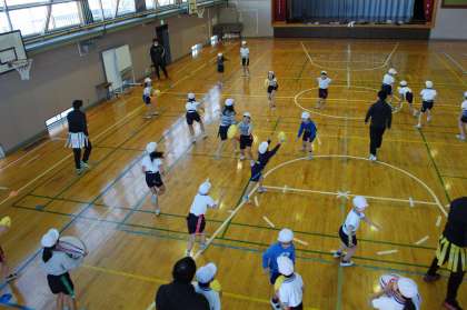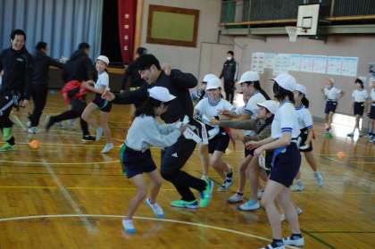 代沢小学校にリコーのラグビー部をゲストティーチャーに迎え、タグラグビー教室を行いました。