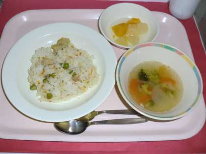 三色ピラフ 牛乳 冬野菜のスープ ミックスフルーツ