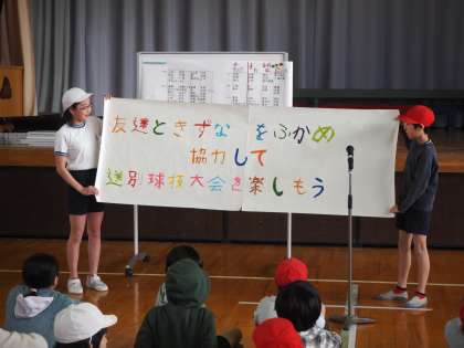 毎年行われている、5年生が中心となって運営をする大会です。今年は「友達ときずなを深め協力して送別球技大会を楽しもう」をスローガンとして掲げました。
