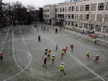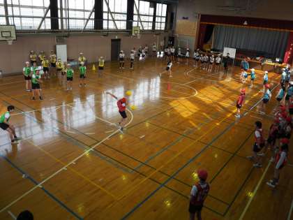 体育館ではヒッチ(外野なしのドッジボール)、校庭ではハンドボールが行われました。始めはお互いに遠慮している様子がみられましたが、ゲームの回数を重ねるにつれ緊張も解け、全力で球技を楽しむ姿が見られました。