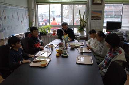 6年生は、2月1日から、校長会食が始まっています。6〜7人のグループで、校長先生と一緒に給食をいただきます。校長先生のする様々なお話で、楽しい時間を過ごせています。