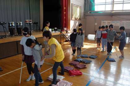 マットやパイプ椅子で障害物を作り、アイマスクをしたり、車いすに乗ったりなどして、体が自由に動かない状態で障害物を通り抜ける体験を行います。日常あまり意識しないことでも、とても不自由に感じる人がいることを体験を通じて学習できました。